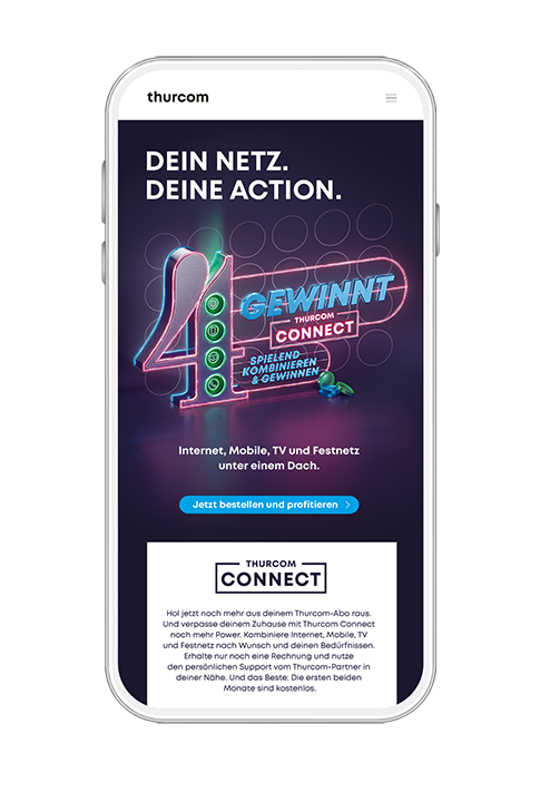 Hol jetzt noch mehr aus deinem Thurcom-Abo raus. Und verpasse deinem Zuhause mit Thurcom Connect noch mehr Power. Kombiniere Internet, Mobile, TV und Festnetz nach Wunsch und deinen Bedürfnissen. Erhalte nur noch eine Rechnung und nutze den persönlichen Support vom Thurcom-Partner in deiner Nähe.
